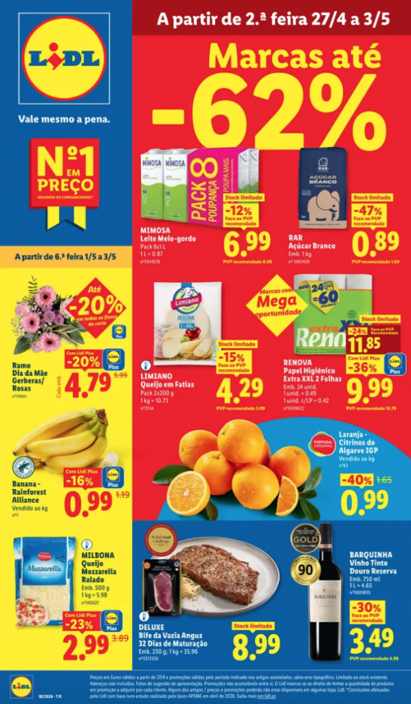 Novo folheto Lidl – Descontos em grandes marcas até 62%. A partir de 2ª Feira 26 Abril.